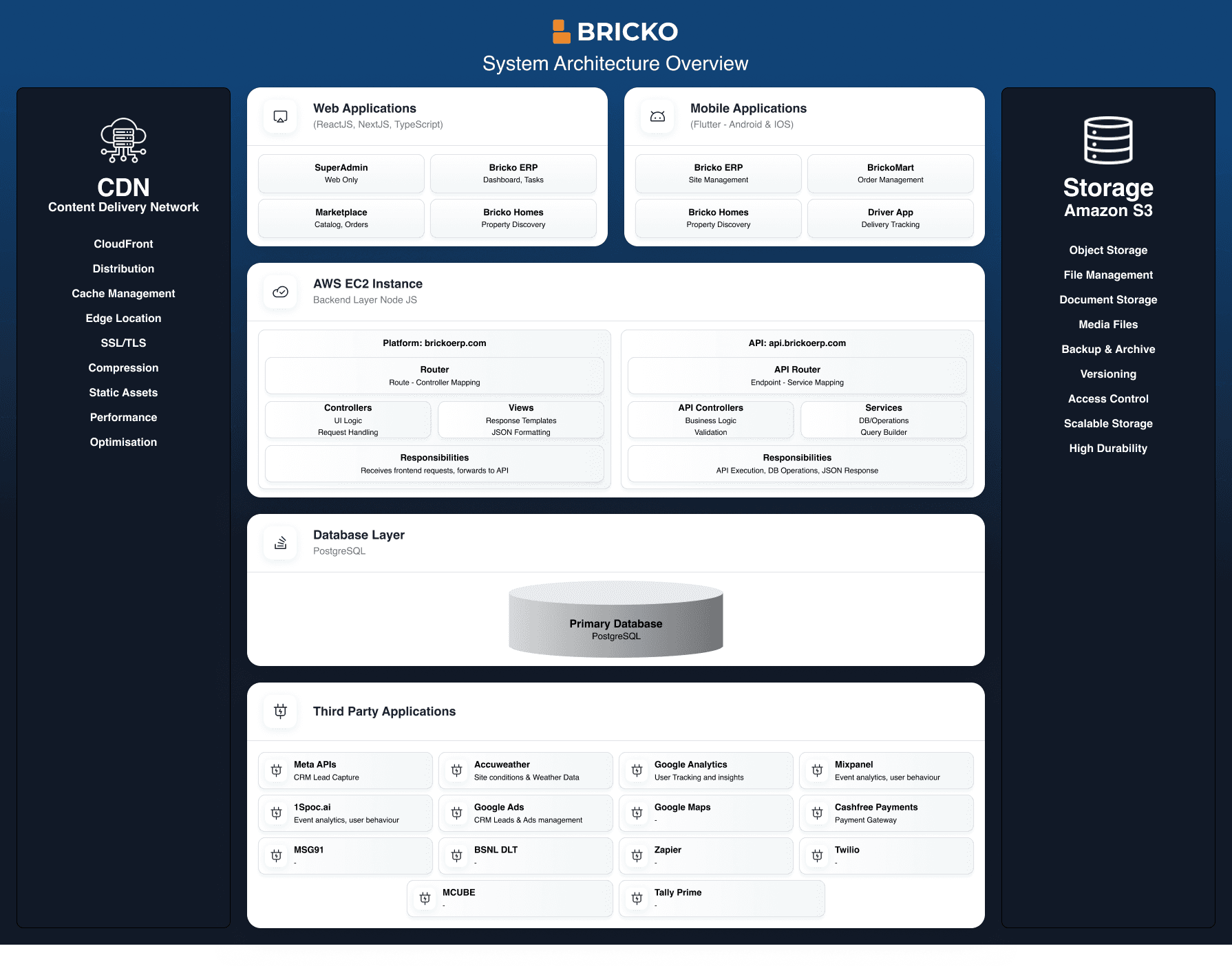 Bricko was envisioned as a unified digital platform for the real estate ecosystem — bringing together home buyers, builders, vendors, and internal operations under a single system.